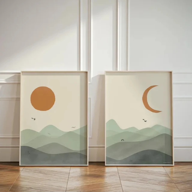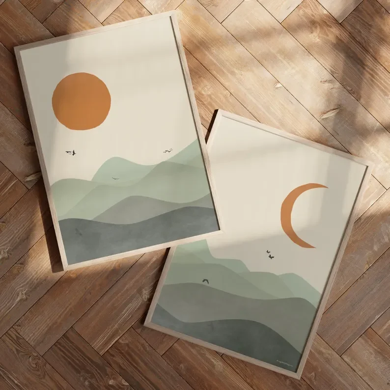 Find harmony in nature’s balance with the Sun & Moon Landscape Canvas Print. Featuring a serene sage green mountainous landscape contrasted by a warm orange sun or moon, this artwork captures the peaceful rhythm between day and night in a modern, minimalist style.