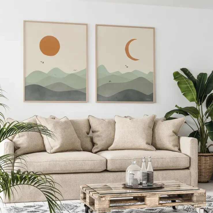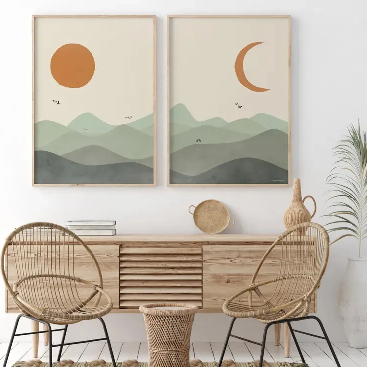 Modern Natural Design: Combines earthy sage greens with a bold orange celestial element, creating a soothing yet striking composition.